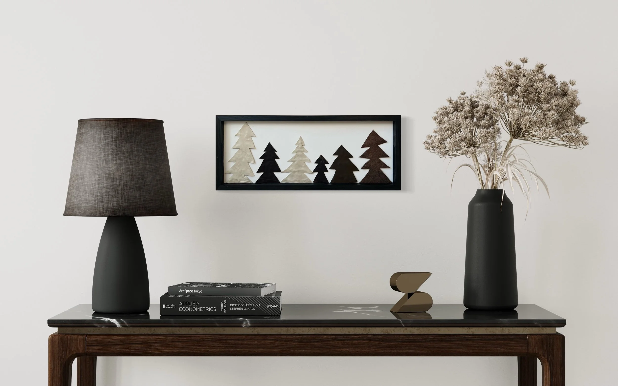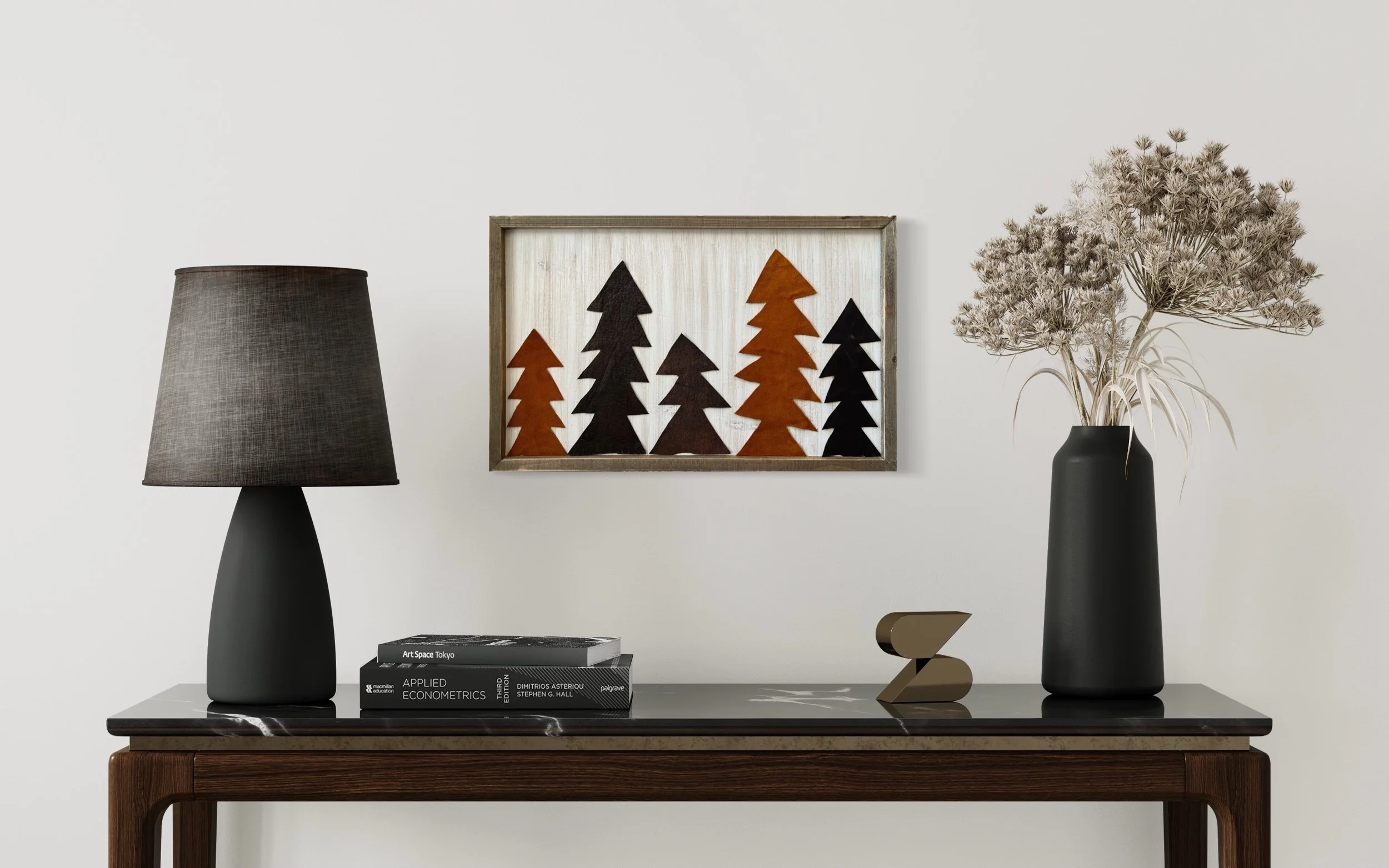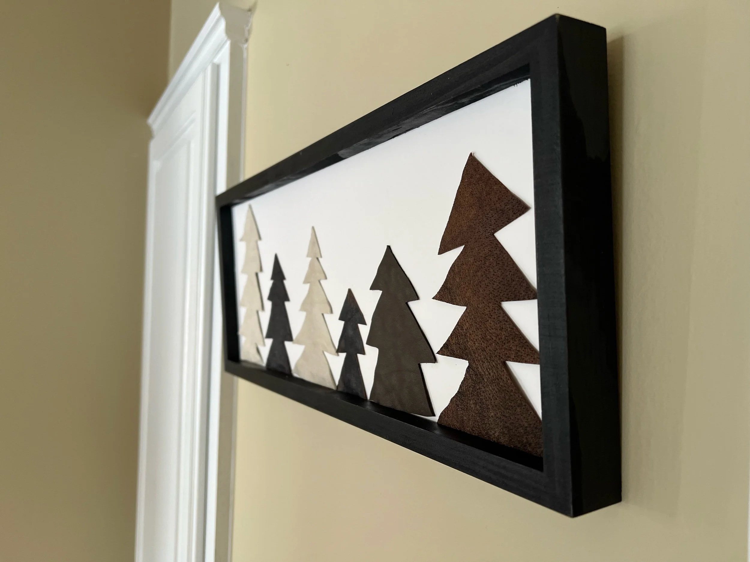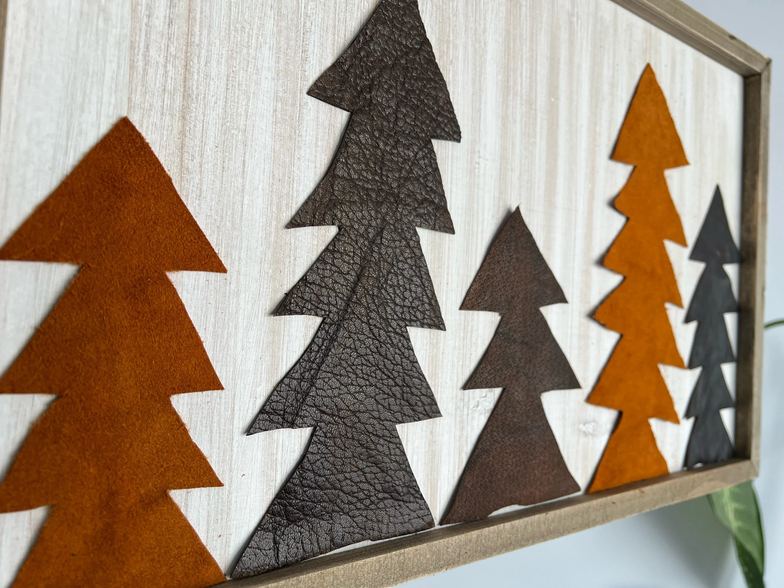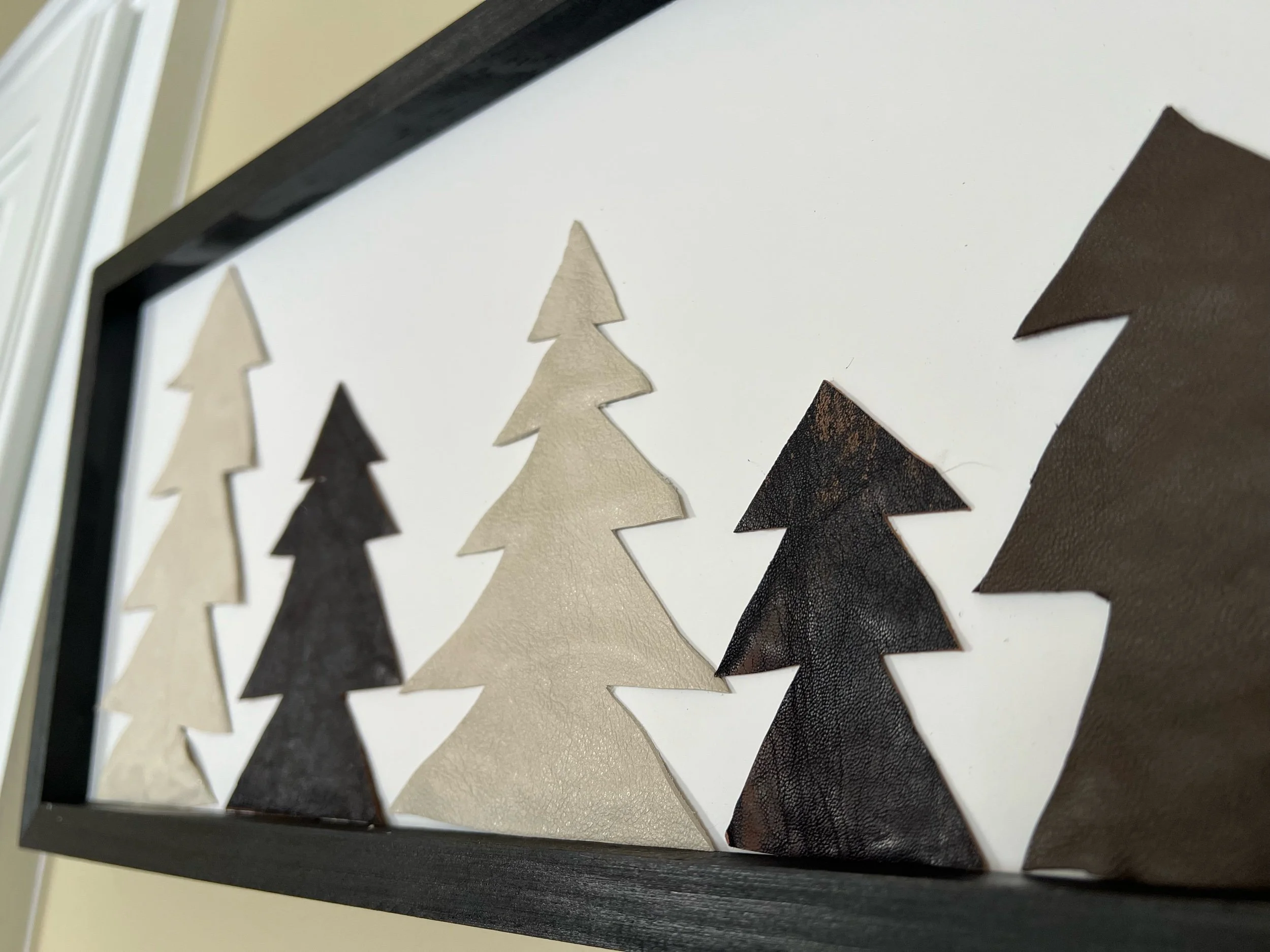 Minimalist wall art featuring hand-cut tree silhouettes made from upcycled leather and set within a wooden frame. No two pieces are exactly alike. Thoughtfully crafted to highlight natural materials, reuse, and simple design inspired by the outdoors.