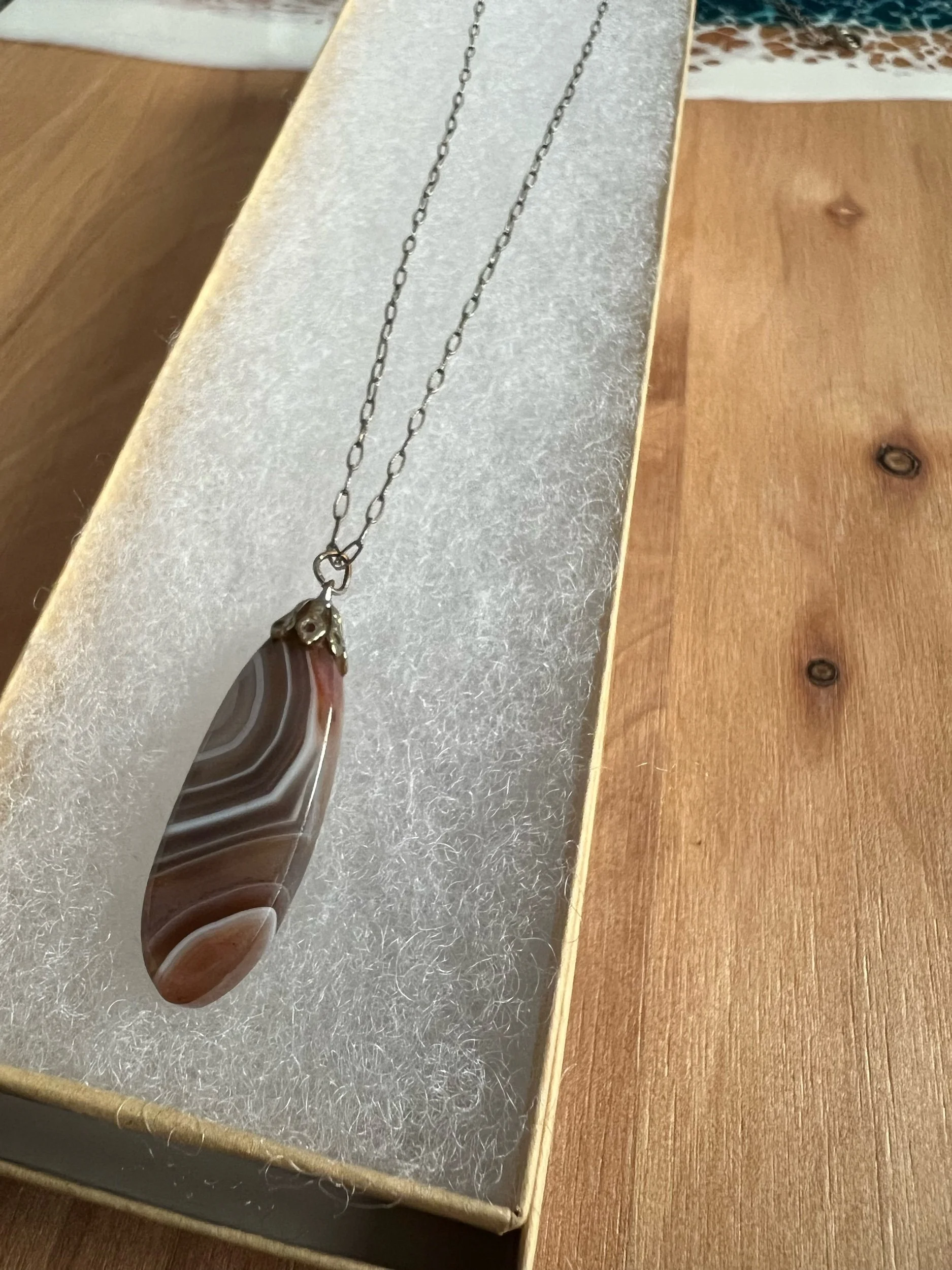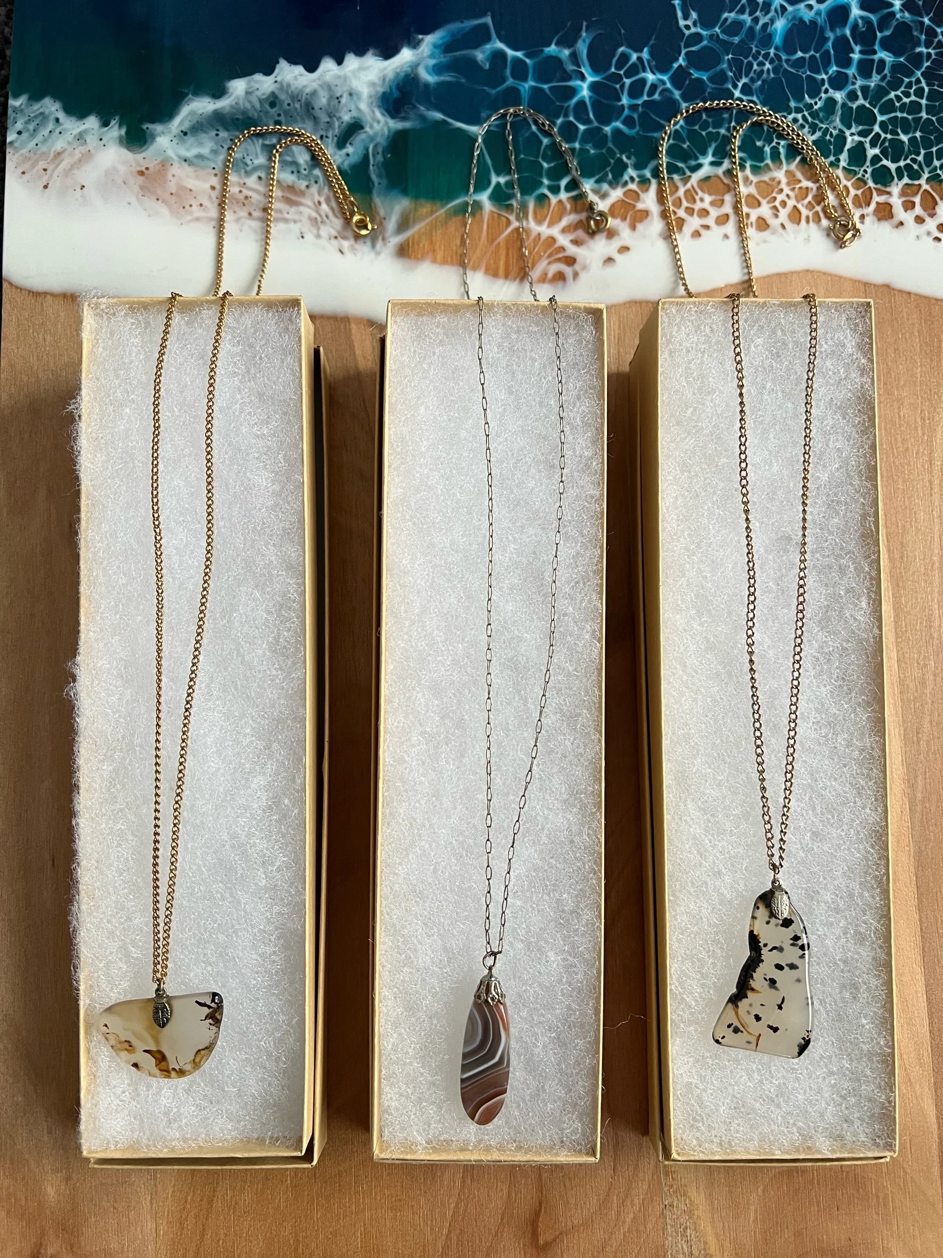 Bring earthy, coastal charm to your wardrobe with these handmade long-chain natural agate necklaces. Each stone is unique, polished, and paired with a vintage-inspired chain for an effortless, timeless look.